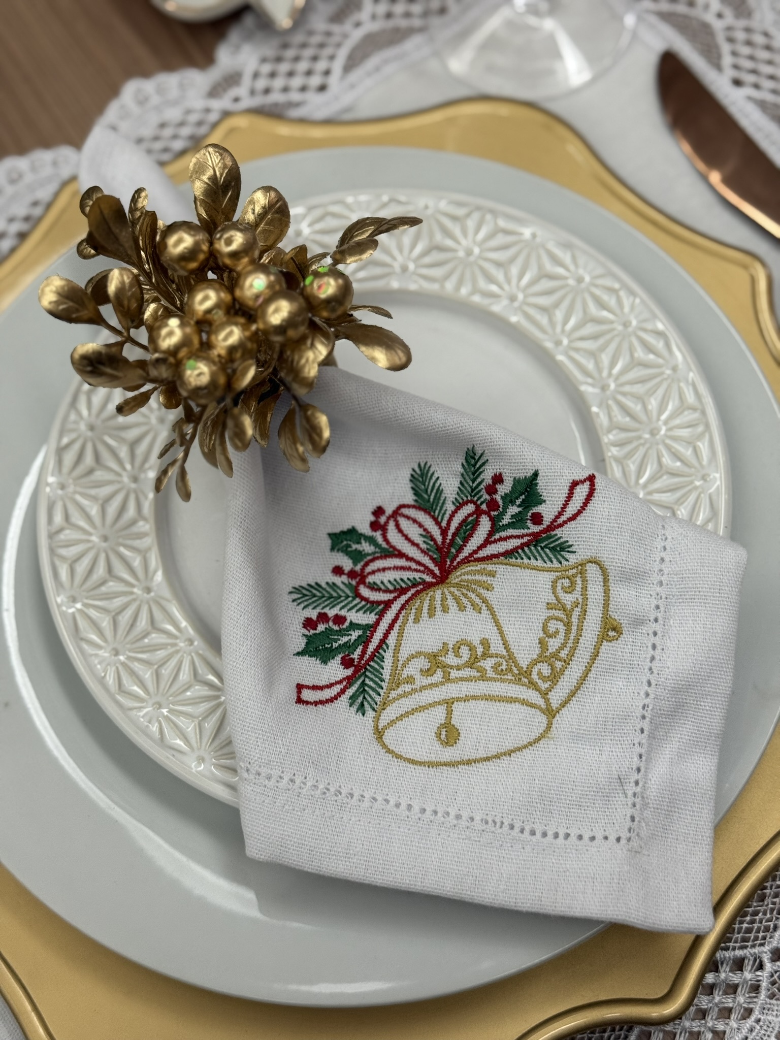 Celebre o Natal com o encanto e a delicadeza deste guardanapo em linho misto, bordado com um lindo sino dourado adornado por laço e folhagens natalinas.