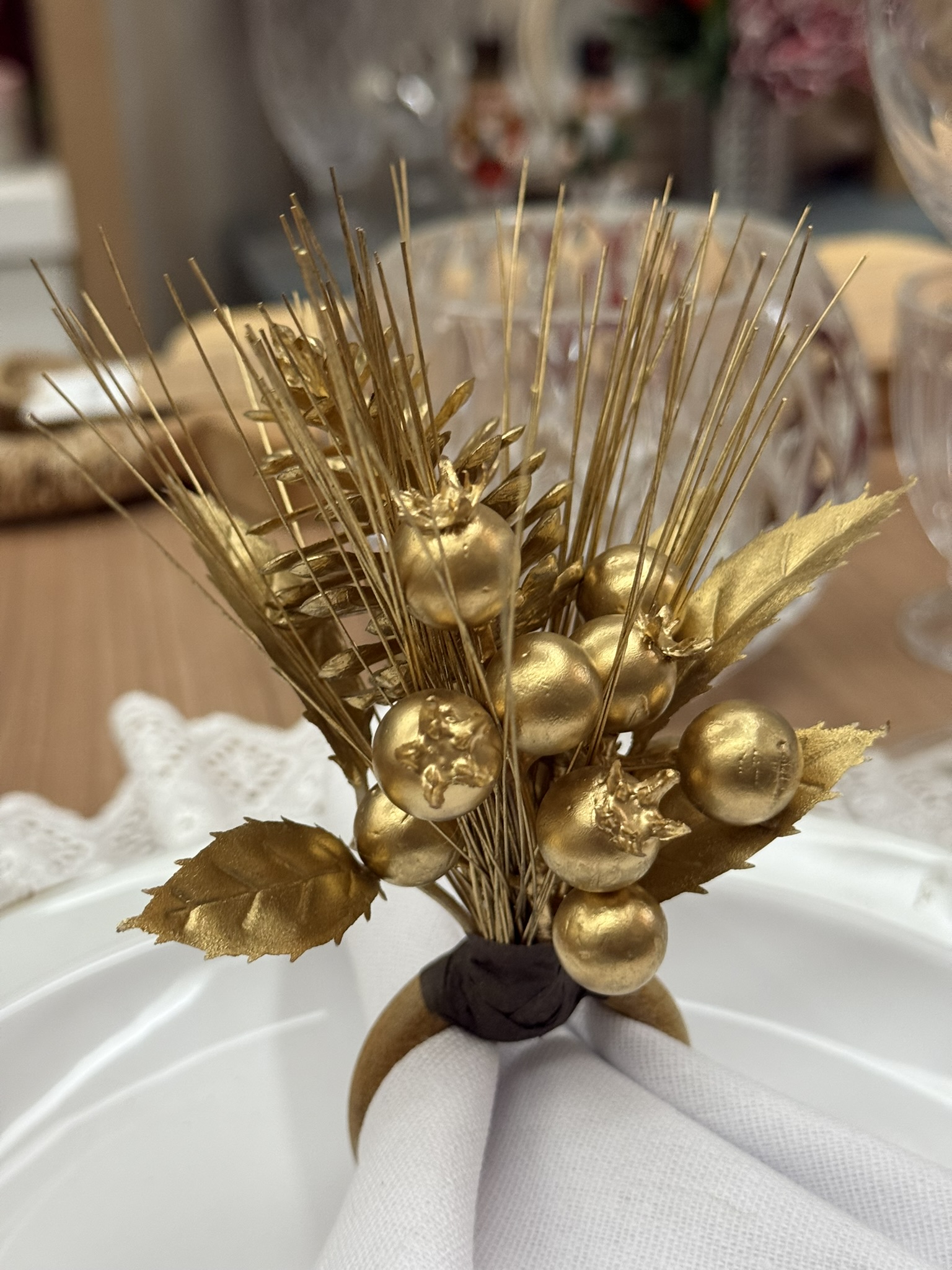 O mix de frutinhas, folhas e hastes douradas cria um arranjo delicado e imponente ao mesmo tempo, ideal para ocasiões festivas, jantares especiais ou decorações de fim de ano.