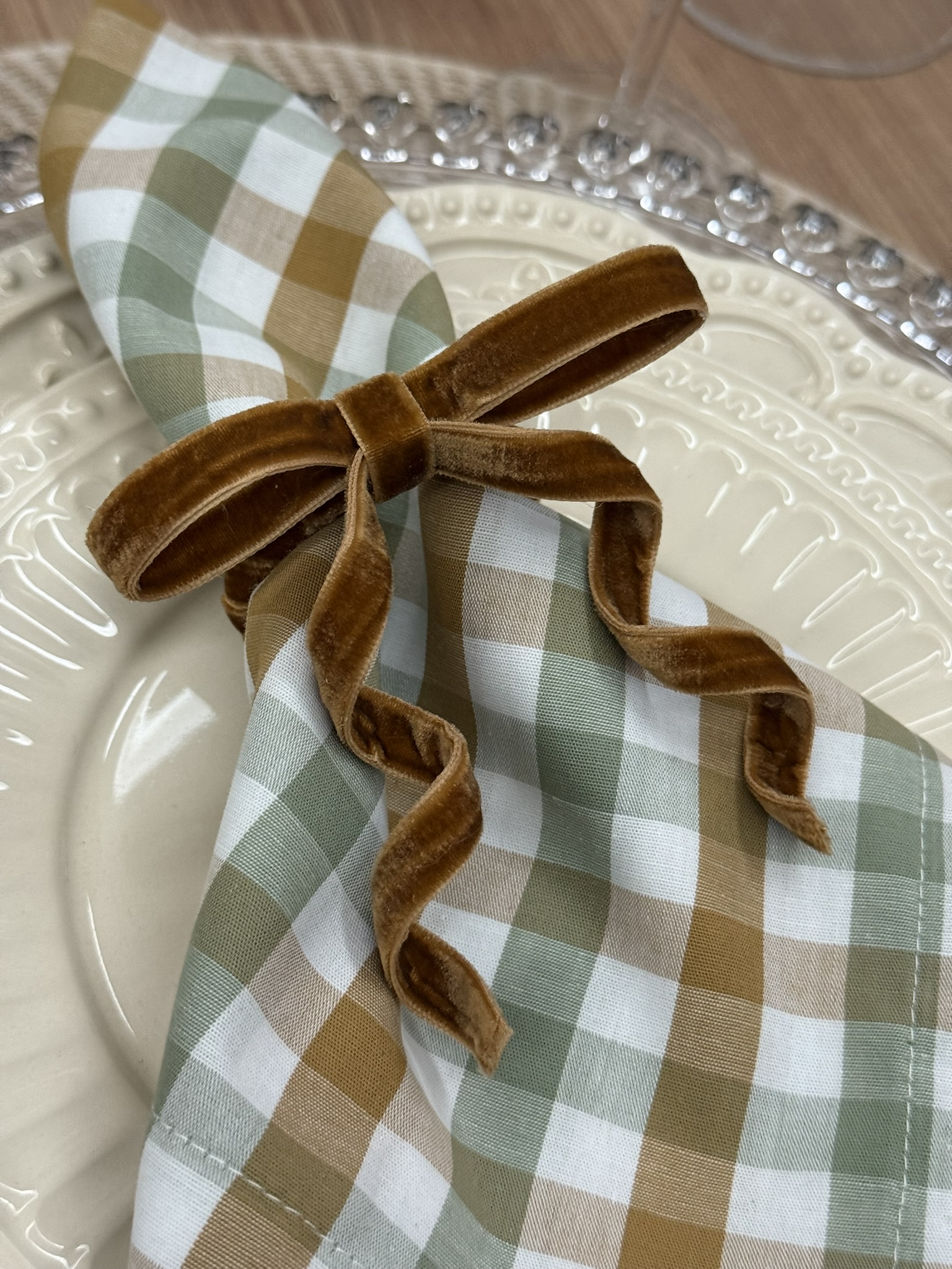 Adicione um toque de charme e sofisticação à sua mesa posta com nosso porta-guardanapo em laço de veludo caramelo. Feito artesanalmente, ele combina elegância e delicadeza em um design que valoriza qualquer composição — do café da manhã ao jantar especial.