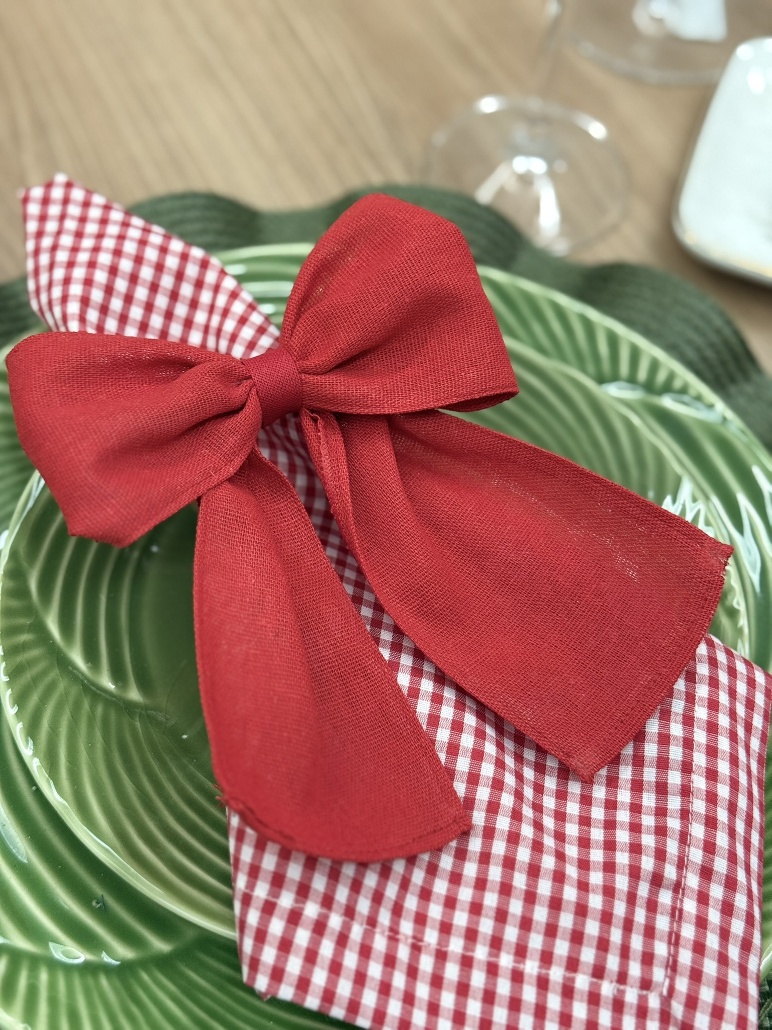 Com a textura nobre do linho e o vermelho clássico do Natal, este laço destaca a composição, trazendo charme, delicadeza e aquele toque acolhedor que faz toda a diferença nos momentos especiais.