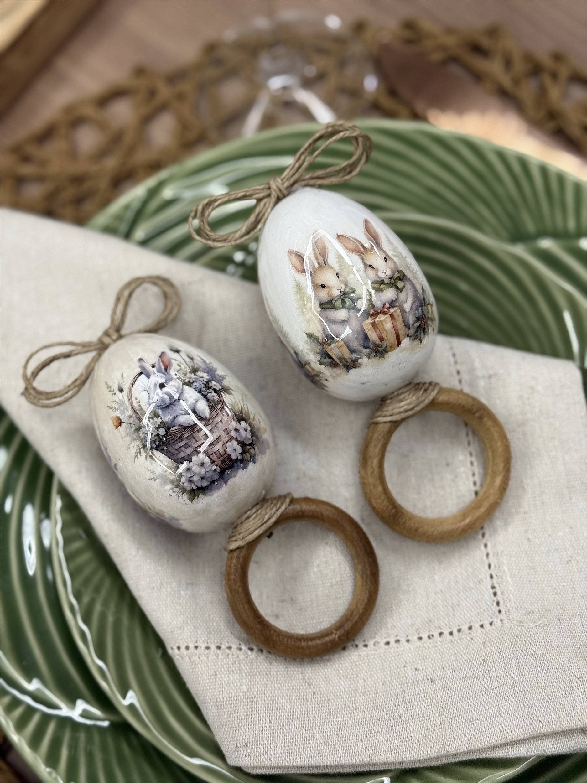 Este conjunto é composto por dois porta guardanapos com estampas diferentes, trazendo ilustrações exclusivas de coelhinhos em estilo clássico, aplicadas em formato de ovo decorativo, com acabamento em laço rústico e argola em madeira.