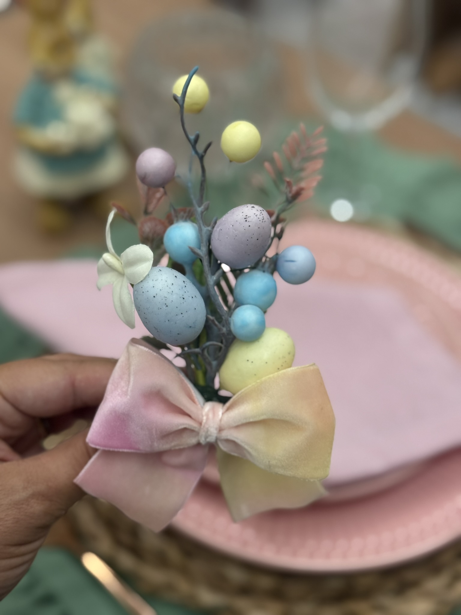 Com composicao suave em tons pastel, o modelo traz pequenos ovos decorativos, folhagens delicadas e laco em tons rosa e amarelo, criando uma peca romantica, alegre e perfeita para mesas de Pascoa.